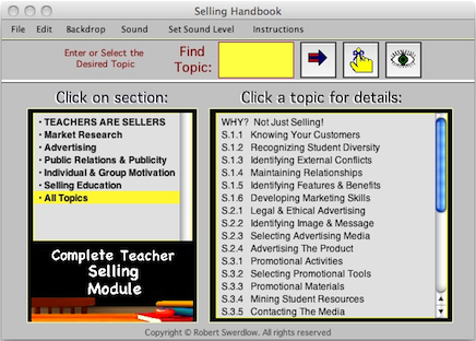 Great teachers are also successful SELLERS! They know how to motivate and excite their students. Teachers who can effectively demonstrate marketing skills appear to be some of our better teachers. Use the SELLING ROLE module to hone your skills relating to advertising, promotion, public relations, publicity, and sales. Like good marketers the best teachers will know their audience, plan the campaign accordingly, and then motivate their students to buy into their product, which is education!